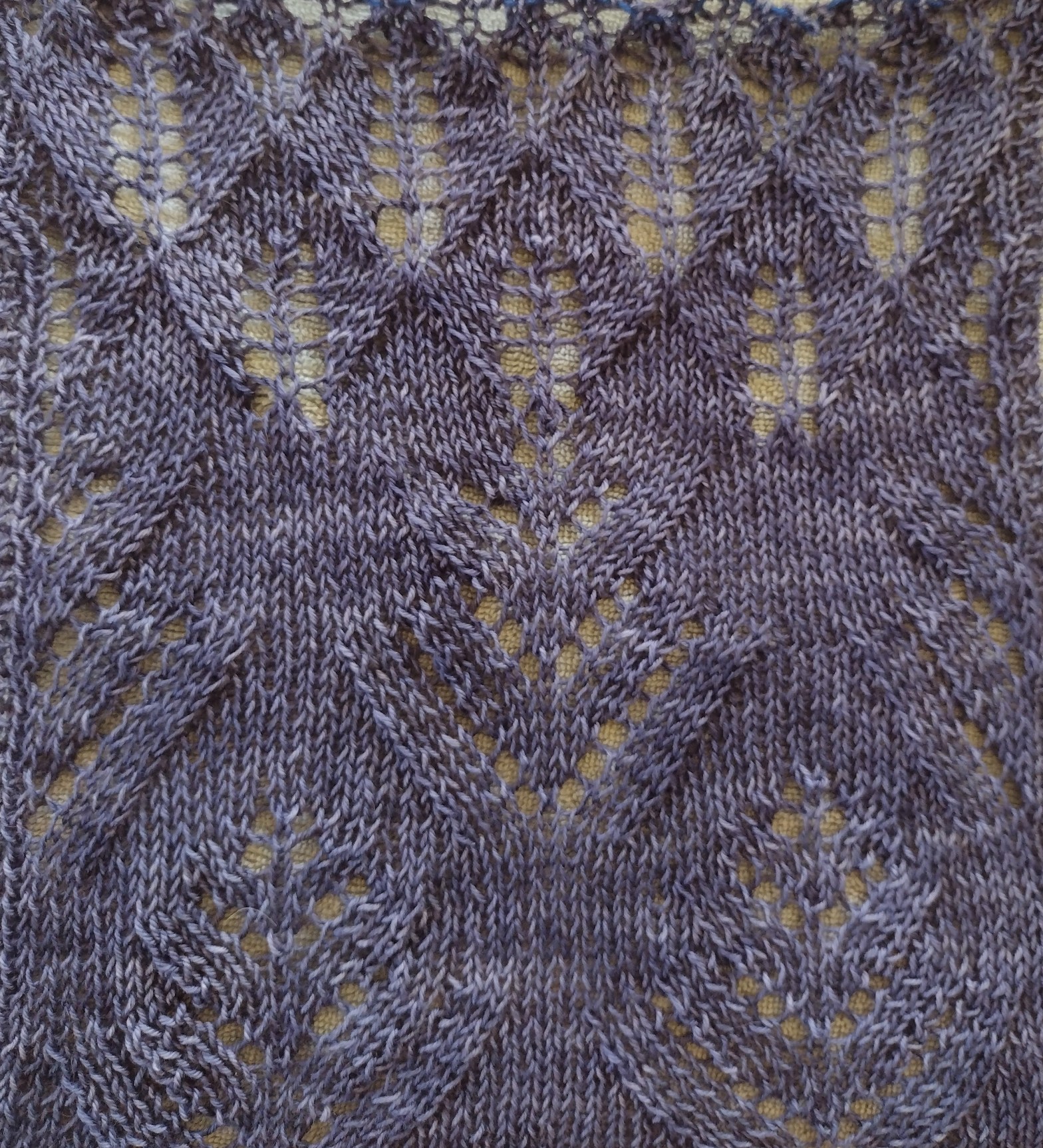 A close-up of a knitted lace sample in a blue-gray yarn. The lace begins with a stem/leaf pattern and transitions into increasingly smaller leaves.