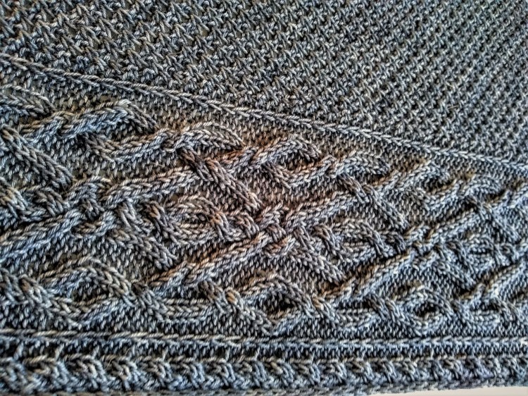 Do you love big shawls but hate long purl rows? Although there are a few purl stitches in the cable panel and along the very edges, the slipped stitch pattern (where most of the increases occur) doesn’t have a single purl stitch!