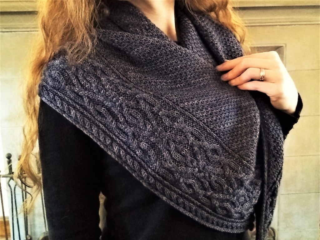 Hearthstone is an asymmetrical triangular shawl knit on the bias. It features a richly textured body and an intricate cable that runs along the bottom edge. The shawl begins with a provisional i-cord cast-on, from which extra stitches are picked up to form the shawl body. Once the cable is established, increases are made along one edge until desired size is achieved.